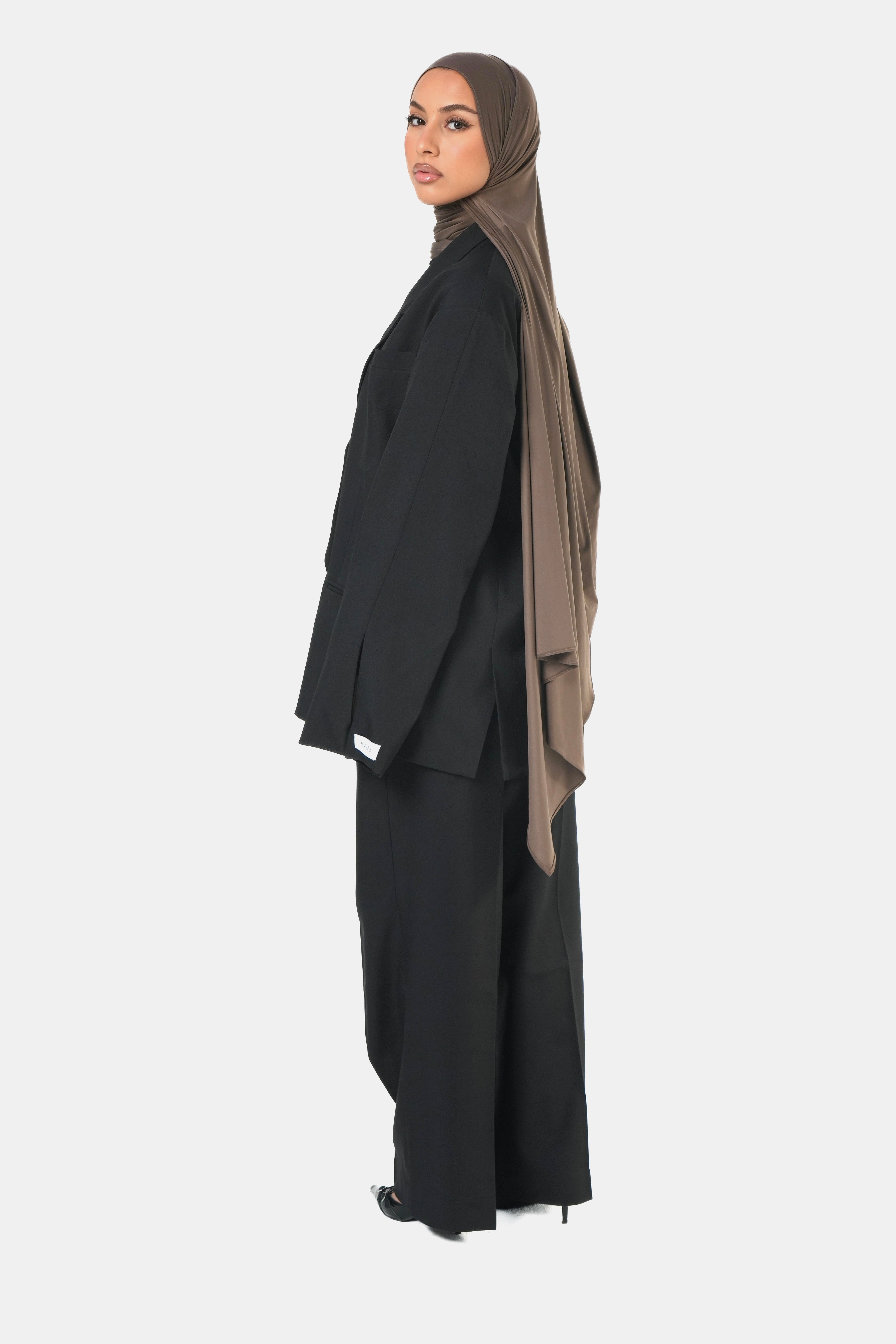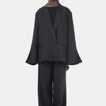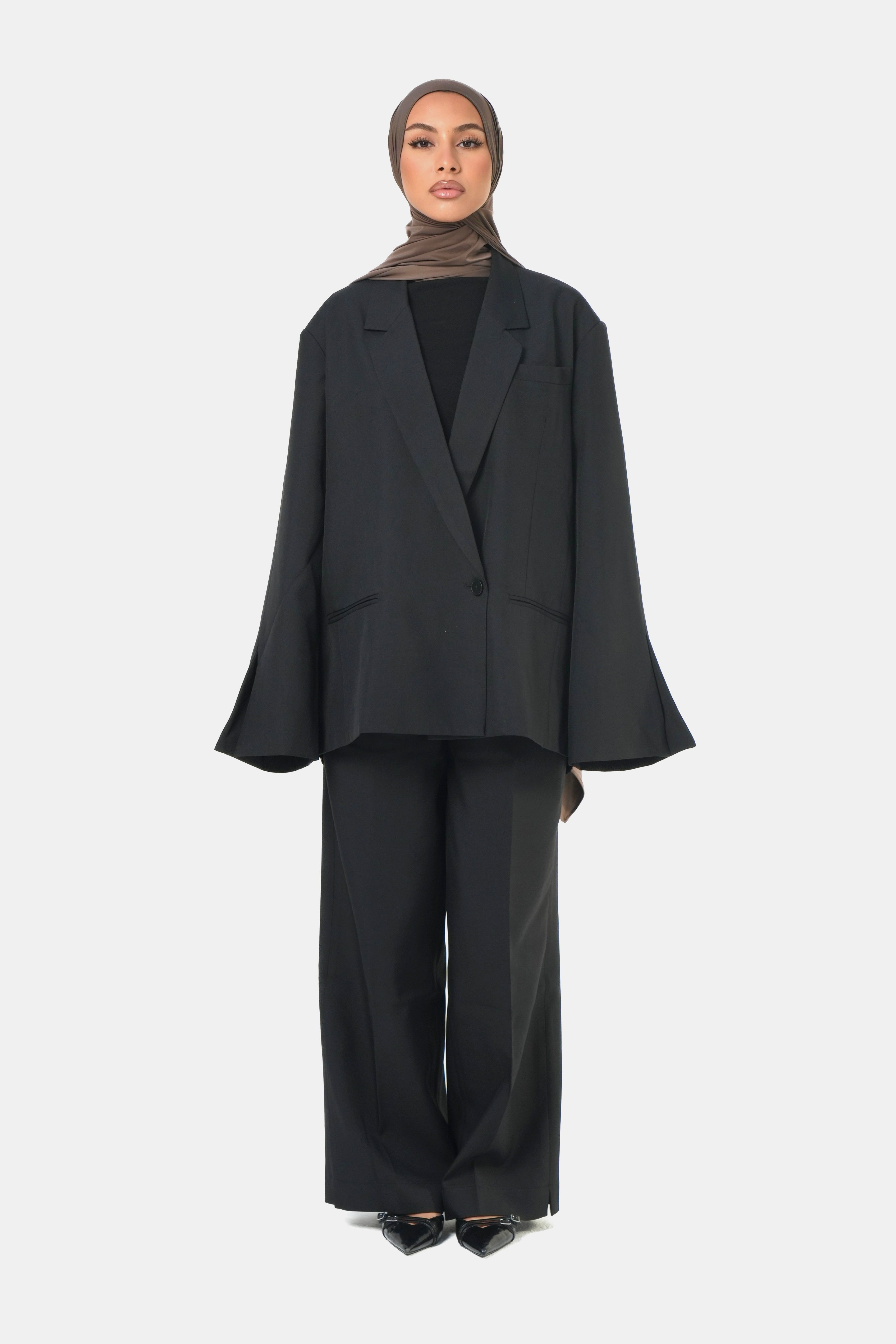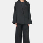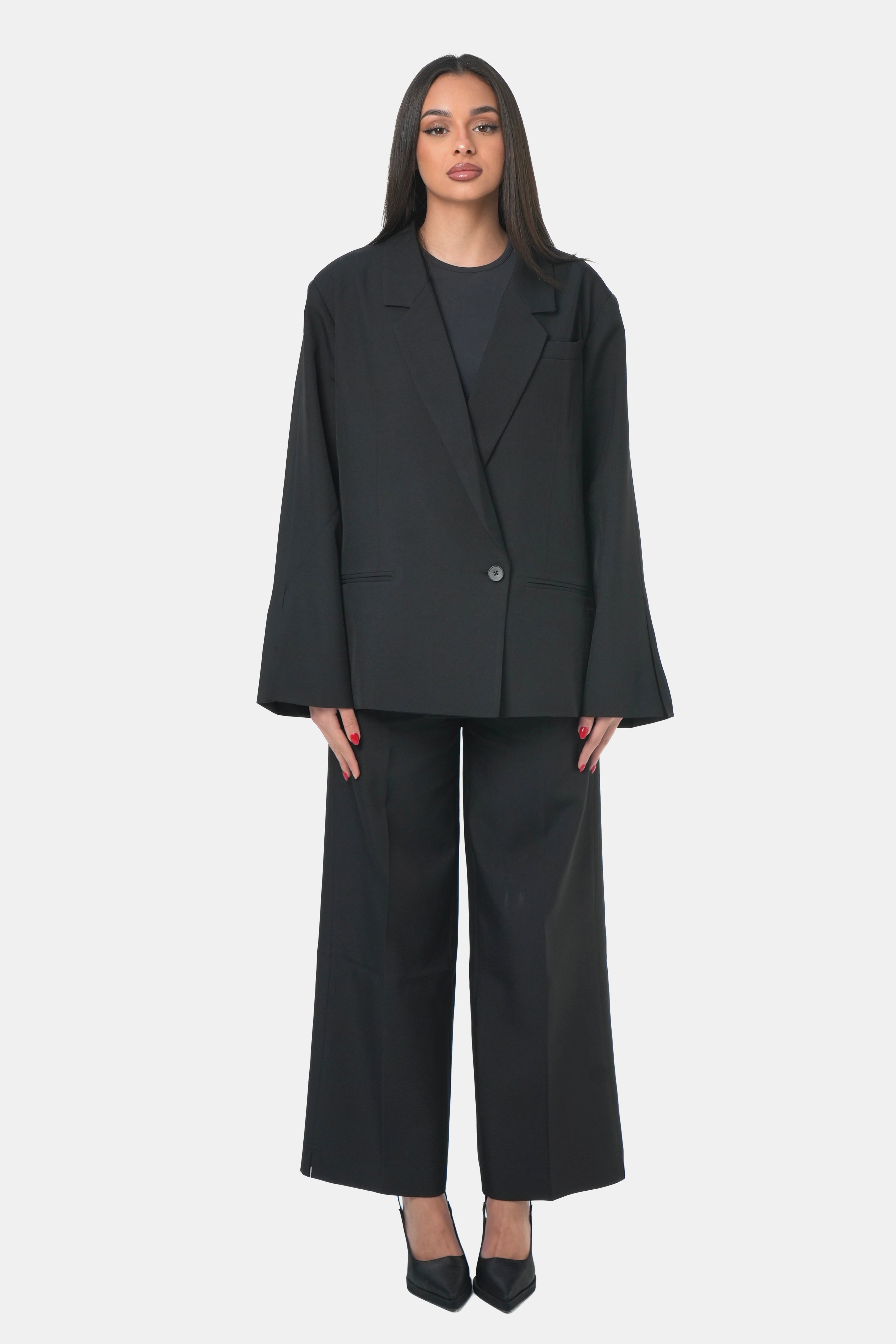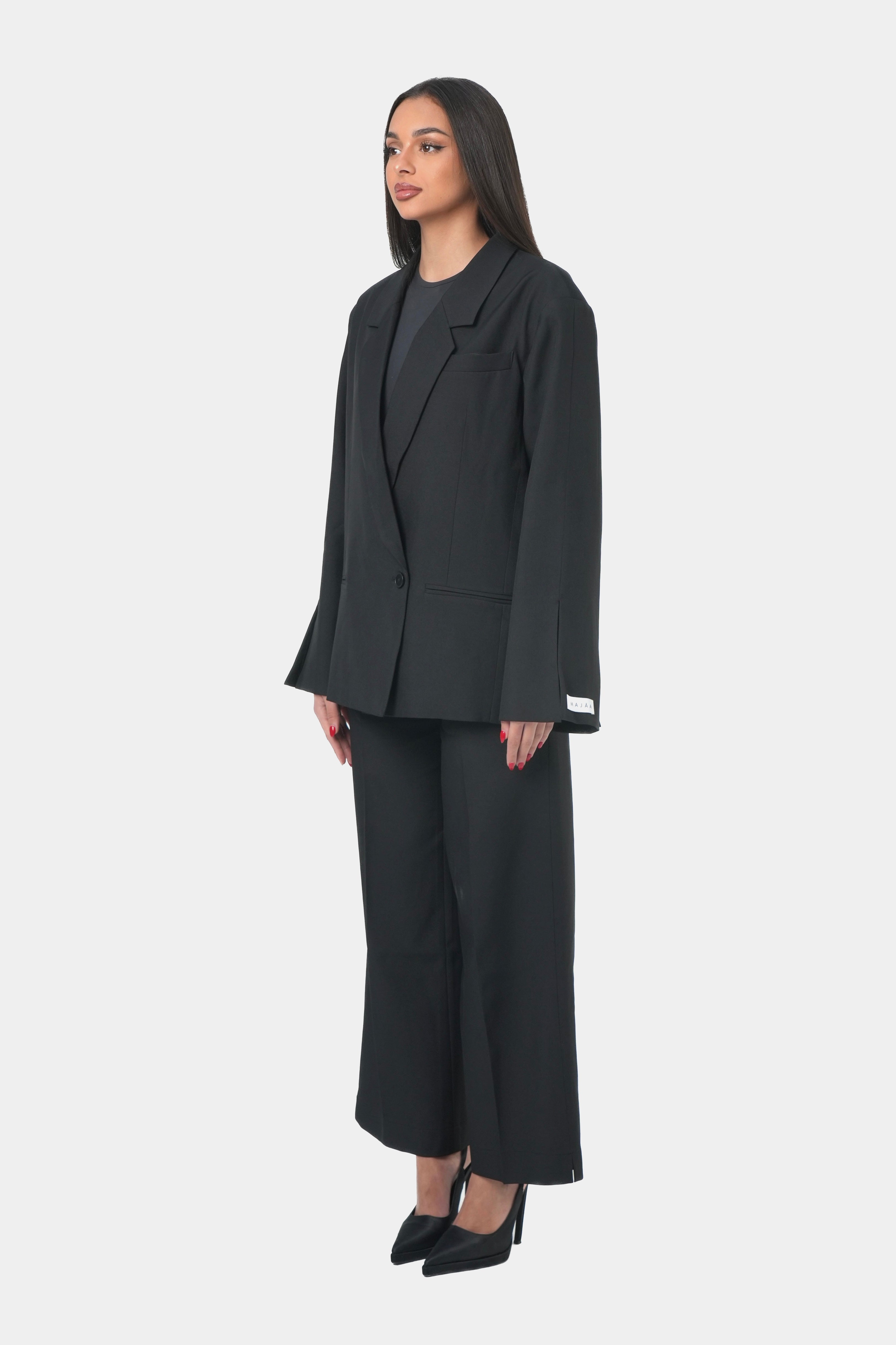 Ensemble tailleur noir composé d’un blazer oversize et d’un pantalon coupe droite.